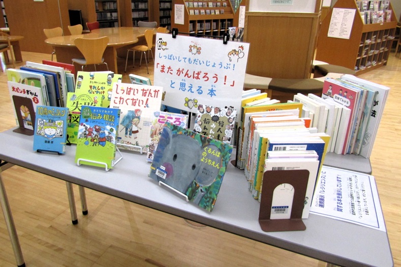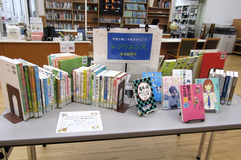 菰野町図書館では菰野町の小中学校と連携し、「レジリエンス=乗り越える力」をテーマとした本をカウンター前にて展示してます。