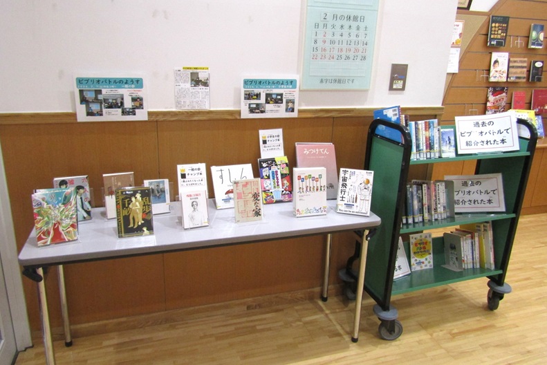 入口横にてビブリオバトルで紹介された本を展示していますので、